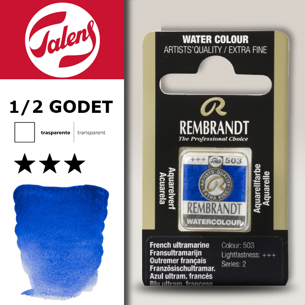 Il Blu Francia Oltremare Rembrandt (cod. 503) è un acquerello professionale che incarna la perfezione del pigmento sintetico che ha sostituito il rarissimo Lapislazzuli. La sua caratteristica più apprezzata è la granulazione: le particelle di pigmento tendono a raggrupparsi delicatamente nelle valli della carta, creando una texture vibrante che dà vita e movimento alle campiture. È un colore trasparente, il che lo rende perfetto per le velature.