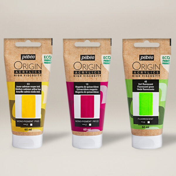 Pébéo Acrilico Origin è una linea di colori ad alta viscosità, pensata per unire prestazioni professionali e sostenibilità ambientale. La sua formula di qualità superiore offre una finitura opaca, una texture ricca e densa, capace di mantenere la traccia del pennello e della spatola, ideale per lavori a impasto e applicazioni materiche.