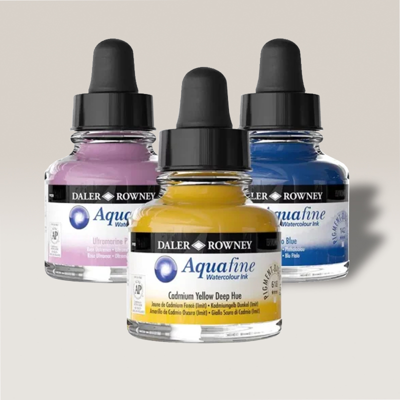 Aquafine Watercolour Ink Daler Rowney. Inchiostro acquerellabile disponibile in 20 colori. La boccetta in vetro con pratico dosatore ti permetterà di gestire il colore in maniera precisa e di lavorare sulle tue illustrazioni e disegni!